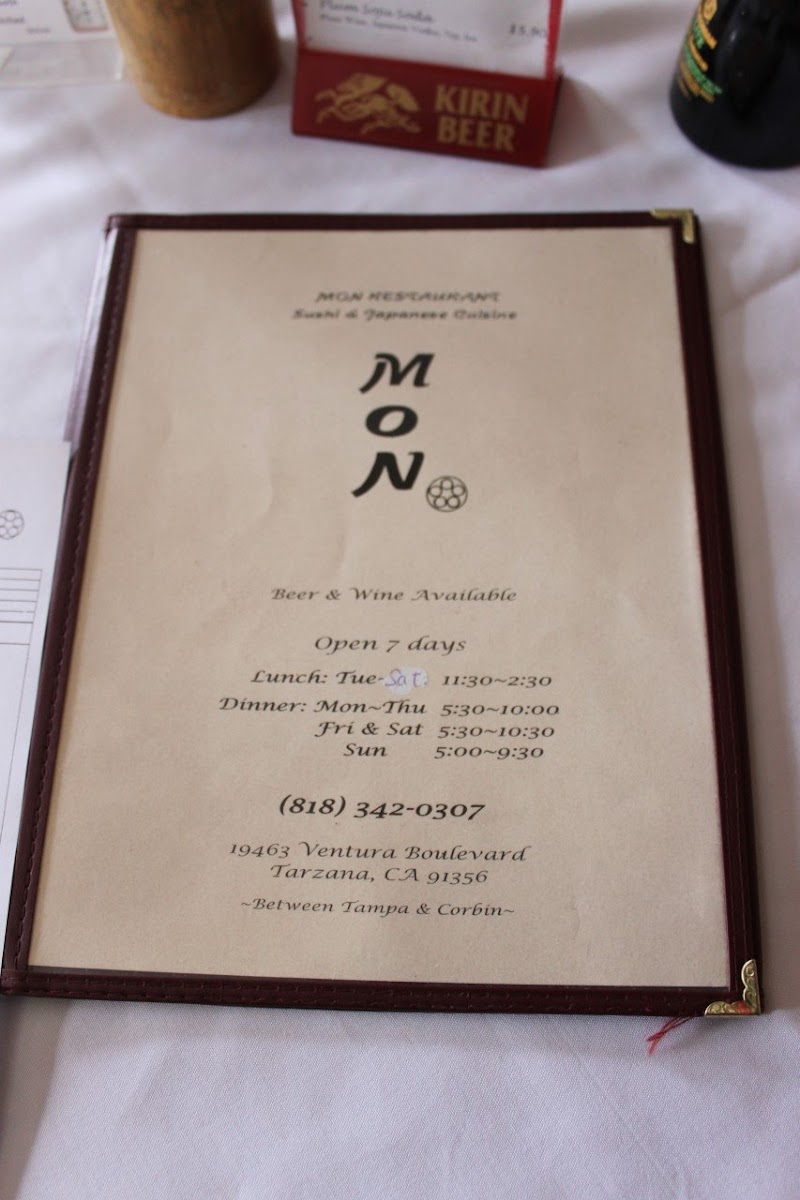At Mon Japanese Restaurant, the menu offers an authentic taste of Japan right in the heart of Tarzana. From fresh sushi rolls to sizzling hibachi plates, there's something for everyone to enjoy. Start with their perfectly crafted nigiri or dive into one of their flavorful bento boxes. If you're in the mood for something warm, the udon and ramen dishes never disappoint. Each dish is prepared with the finest ingredients, ensuring every bite is as satisfying as the last. The diverse menu caters to all tastes, from traditional Japanese favorites to modern twists on classic dishes, making it a must-visit for anyone craving a true Japanese dining experience. Whether you're here for a quick lunch or a cozy dinner with friends, the Mon Japanese Restaurant menu has something to tempt your taste buds.
